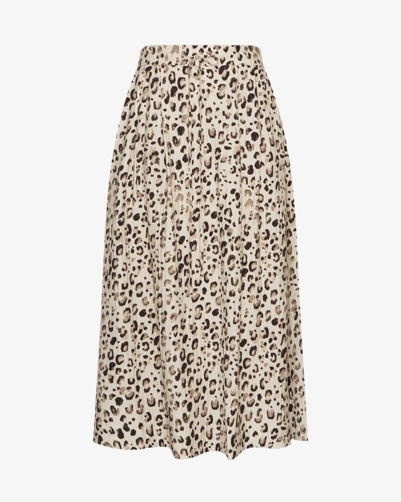 En feminin og let nederdel med et stilfuldt leopardprint i beige og brune toner. Den elastiske talje med skjult bindebånd sikrer en behagelig pasform og et elegant fald. Perfekt til både hverdagsbrug og særlige anledninger.