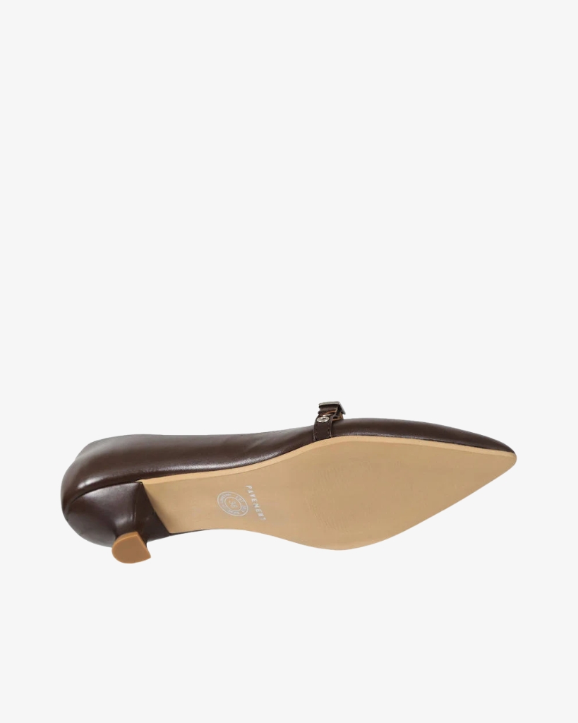 Arian fra Pavement er en elegant pumps i mørkebrunt skind med et feminint og stilrent udtryk. Den spidse snude giver et skarpt look, mens remmen over forfoden med fine metaldetaljer tilfører et eksklusivt touch. Den lave hæl gør skoen behagelig at have på – perfekt til både hverdag og fest.