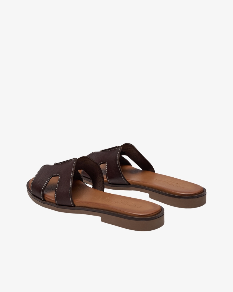 En stilren slip-in sandal i blødt læder med et roligt og eksklusivt udtryk. Det brede overlæder med markante syninger giver et karakterfuldt look, mens den flade sål sikrer let og behagelig komfort hele dagen.