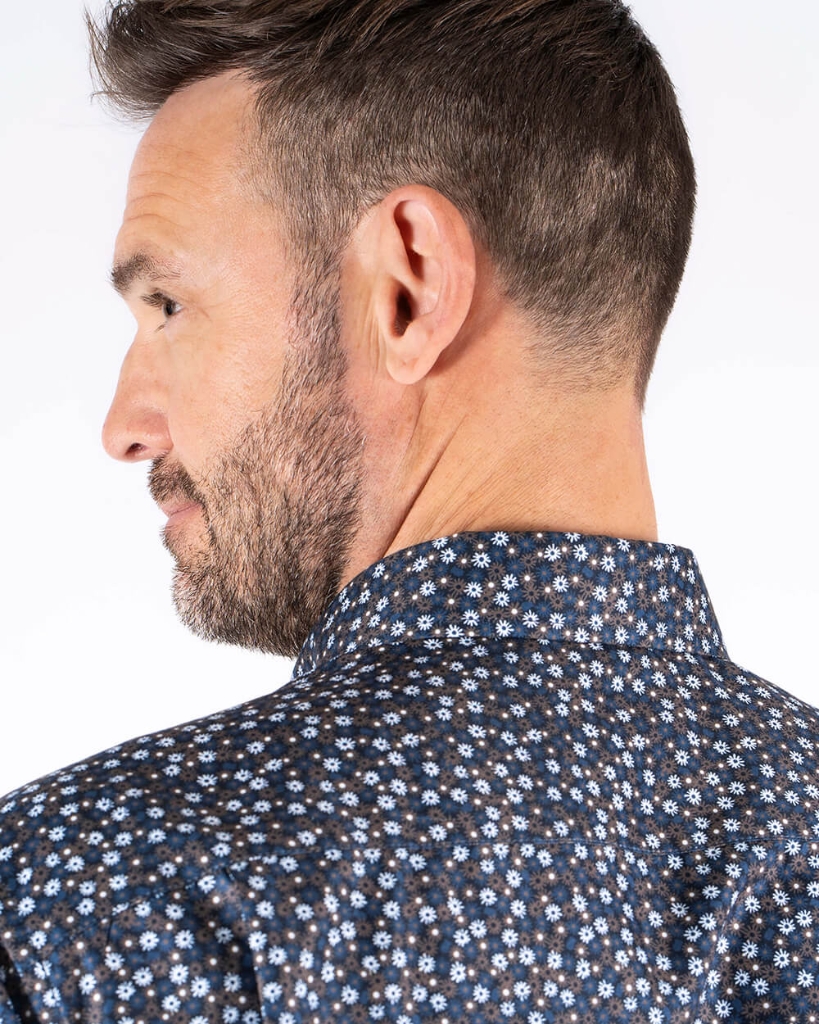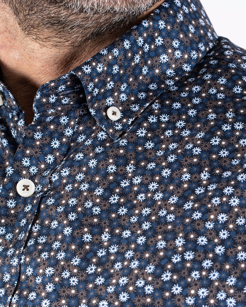 Mørkeblå skjorte med et diskret all-over blomsterprint i lyse nuancer. Skjorten har button-down krave, brystlomme og en klassisk pasform. Et stilrent valg med et strejf af personlighed.