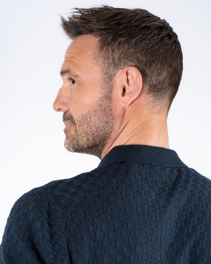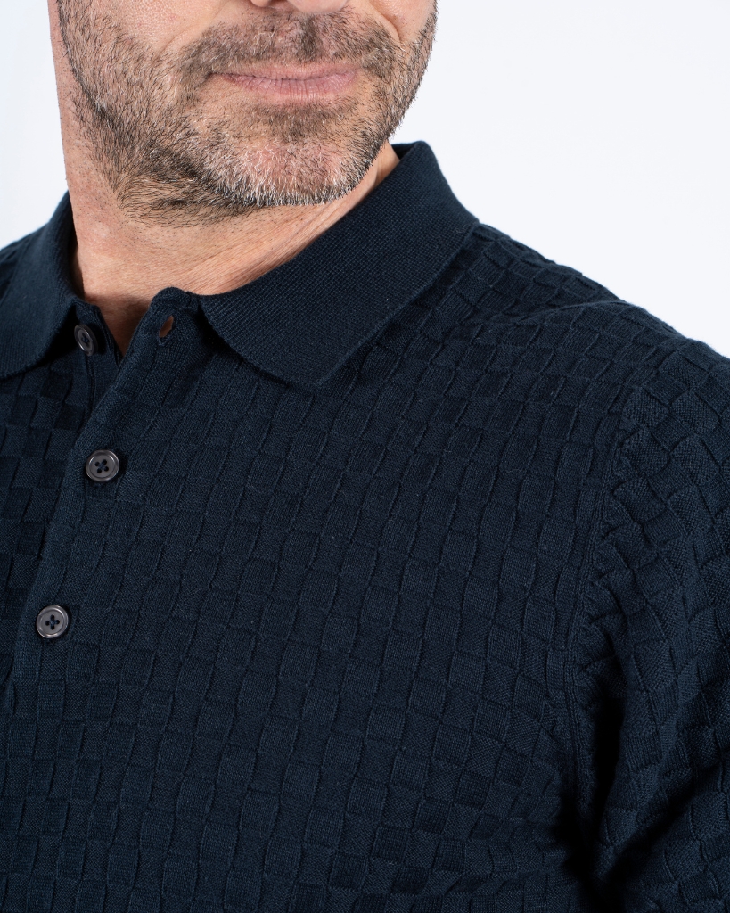 Opgrader garderoben med denne strikkede polo med diskret ternet struktur. Den har en klassisk krave med knaplukning og en blød, behagelig kvalitet. En stilren model med flotte detaljer og god pasform.
