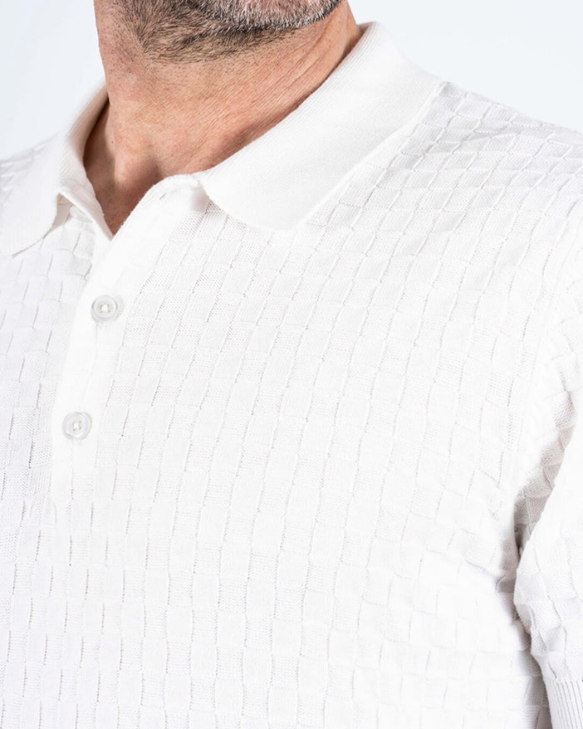 Strikket polo i en lys nuance med et diskret ternet mønster i strukturen. Modellen har en klassisk polokrave med knaplukning og ribkanter, som giver et pænt og velafbalanceret udtryk. En stilren polo med fokus på detaljer i strikken.