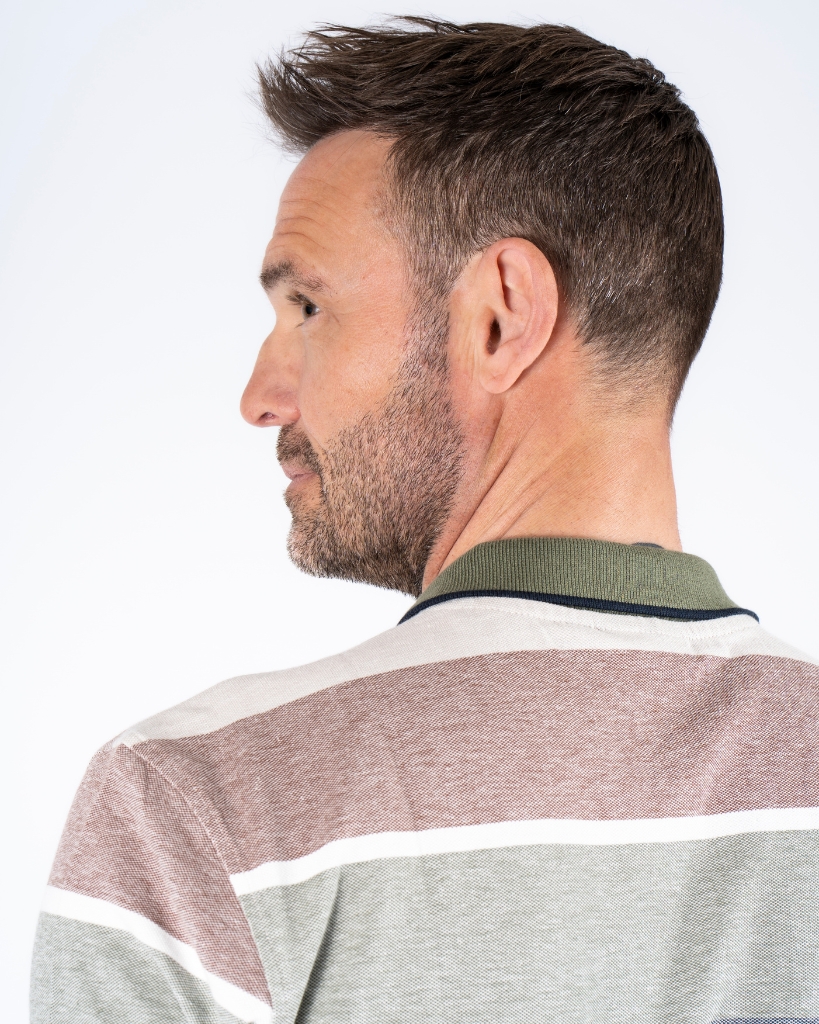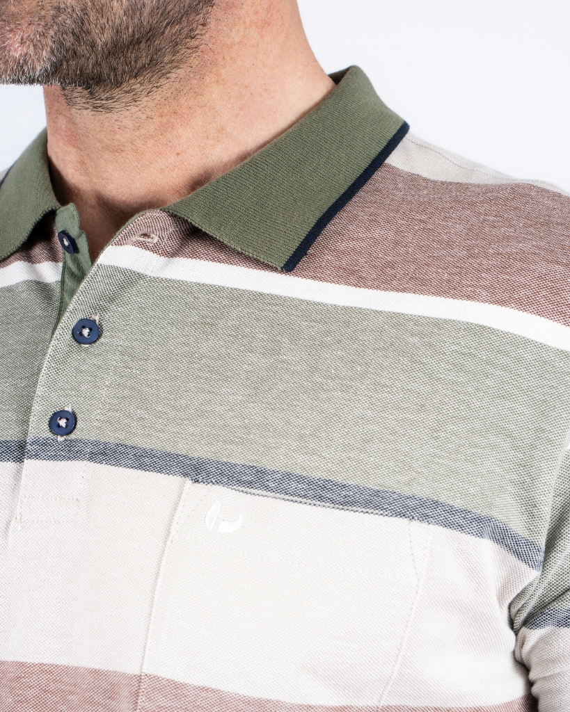 Polo med brede striber i afdæmpede nuancer, der giver et roligt og moderne udtryk. Den er designet med klassisk polokrave, knaplukning og brystlomme samt en behagelig pasform.