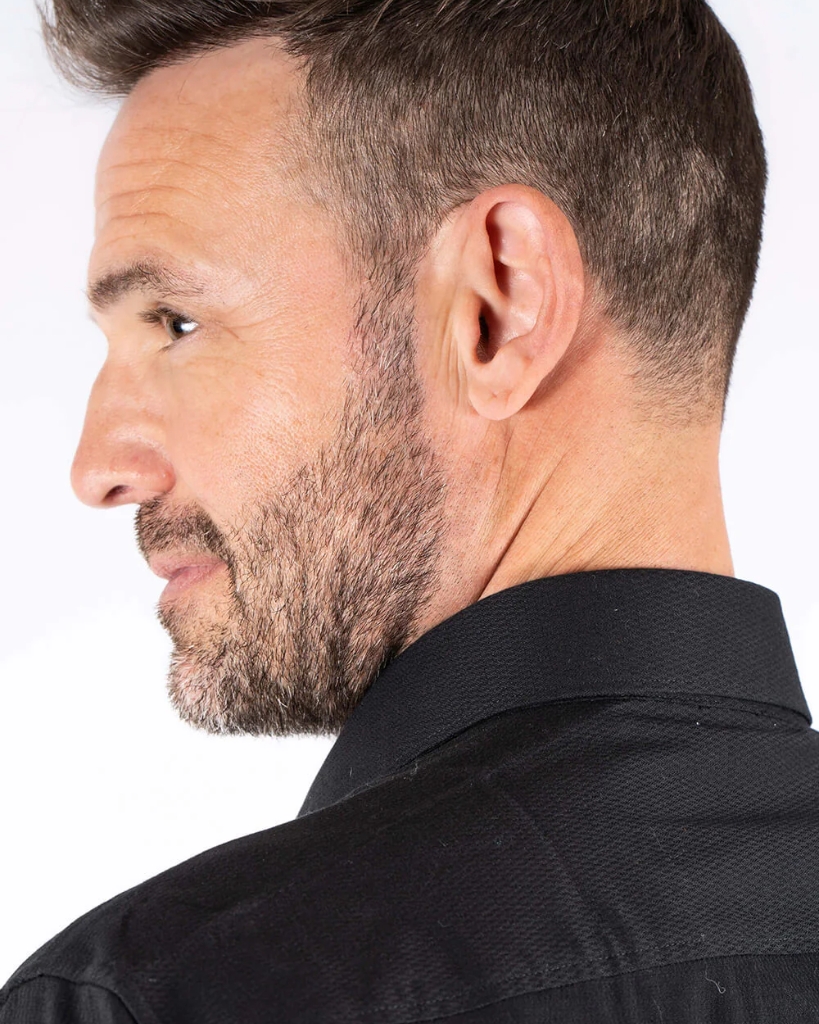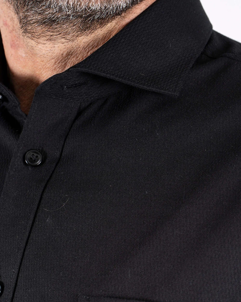 Enkel og stilren sort skjorte med let struktur i stoffet. Modellen har brystlomme, stretch for øget komfort og tonede knapper, der fuldender det rene udtryk.
