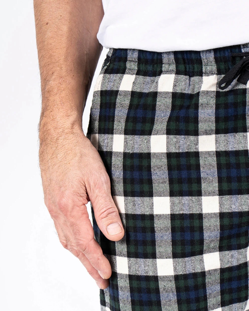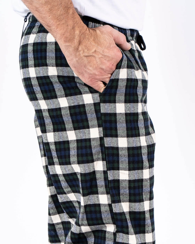 Klassiske ternede pyjamasbukser i grønne og blå nuancer – perfekte til afslapning og rolige morgener. Bukserne er super bløde og har elastik i taljen med snøre samt praktiske lommer i siderne.