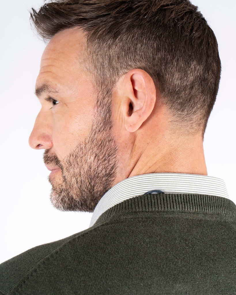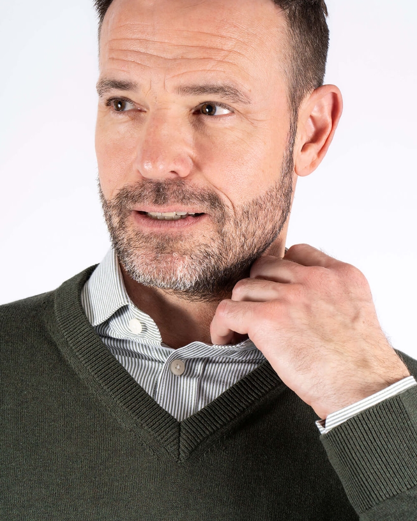 Tidløs og stilren V-hals striktrøje i en behagelig bomuldskvalitet. Perfekt over en skjorte til et pænt og afslappet look. Diskret logo broderet på brystet.