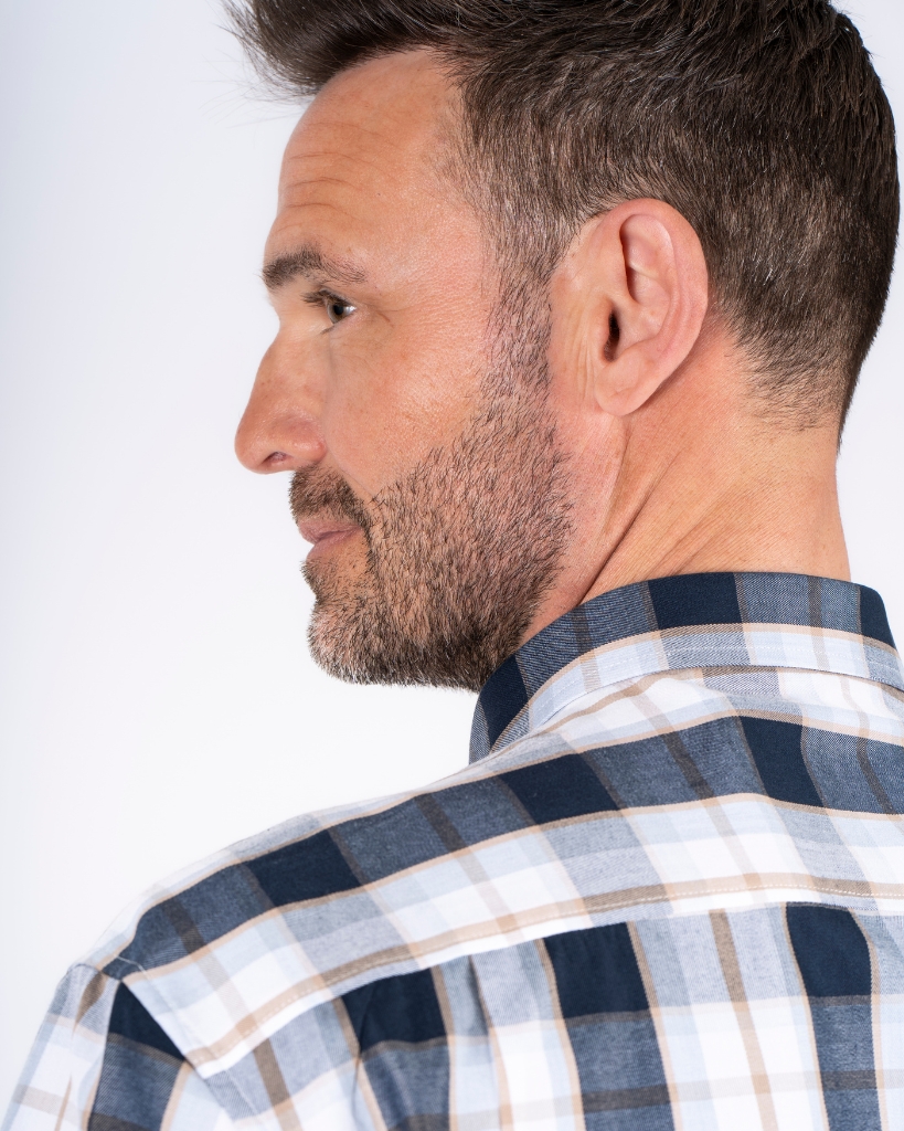 Klassisk kortærmet skjorte med et markant ternet mønster i blå nuancer. Den er lavet i en behagelig comfort fit og har en brystlomme, der giver et klassisk og velkendt udtryk. En let kvalitet, der er rar at have på.