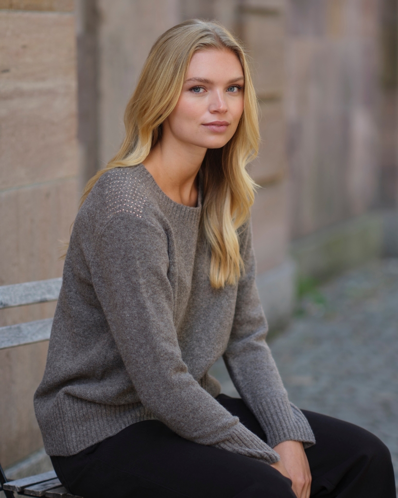 Babara Striktrøje er en feminin og behagelig strik med elegante guldnitter på skuldrene. Den har rund hals og afsluttes med ribkanter, der giver et pænt og klassisk look.