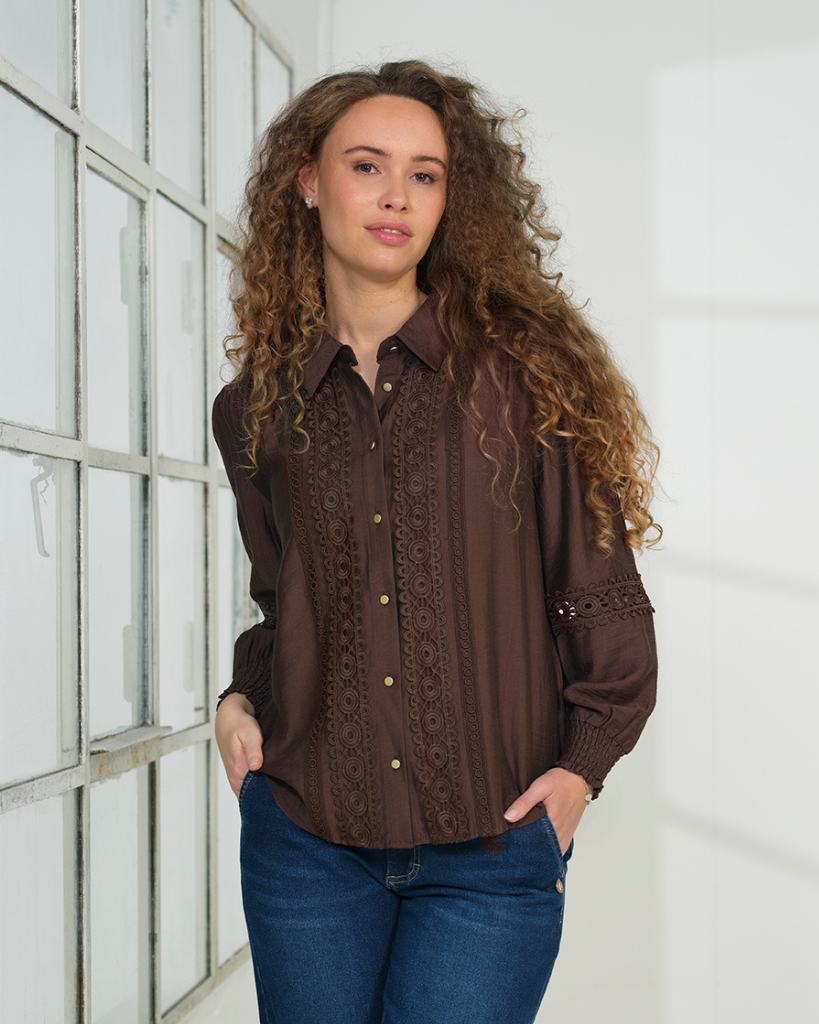 Lila Blouse er en elegant skjortebluse med smukke blondedetaljer langs front og ærmer. Den har klassisk skjortekrave, bløde læg ved skuldrene og lange ærmer med smock ved håndleddene. En bluse med masser af feminine detaljer og et eksklusivt udtryk.