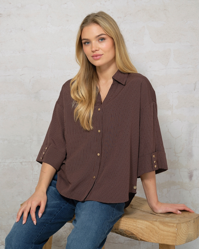 Lydia Blouse er en afslappet skjortebluse med fine, lodrette striber i en varm blommefarve. Den har klassisk krave og gennemgående knaplukning med små gyldne knapper. De trekvartlange ærmer har brede manchetter med dekorative knapper, og lægget i ryggen giver et flot, levende fald. PREPAIR er generelt lidt stor i størrelsen – ligger du mellem to størrelser, anbefaler vi den mindste.
