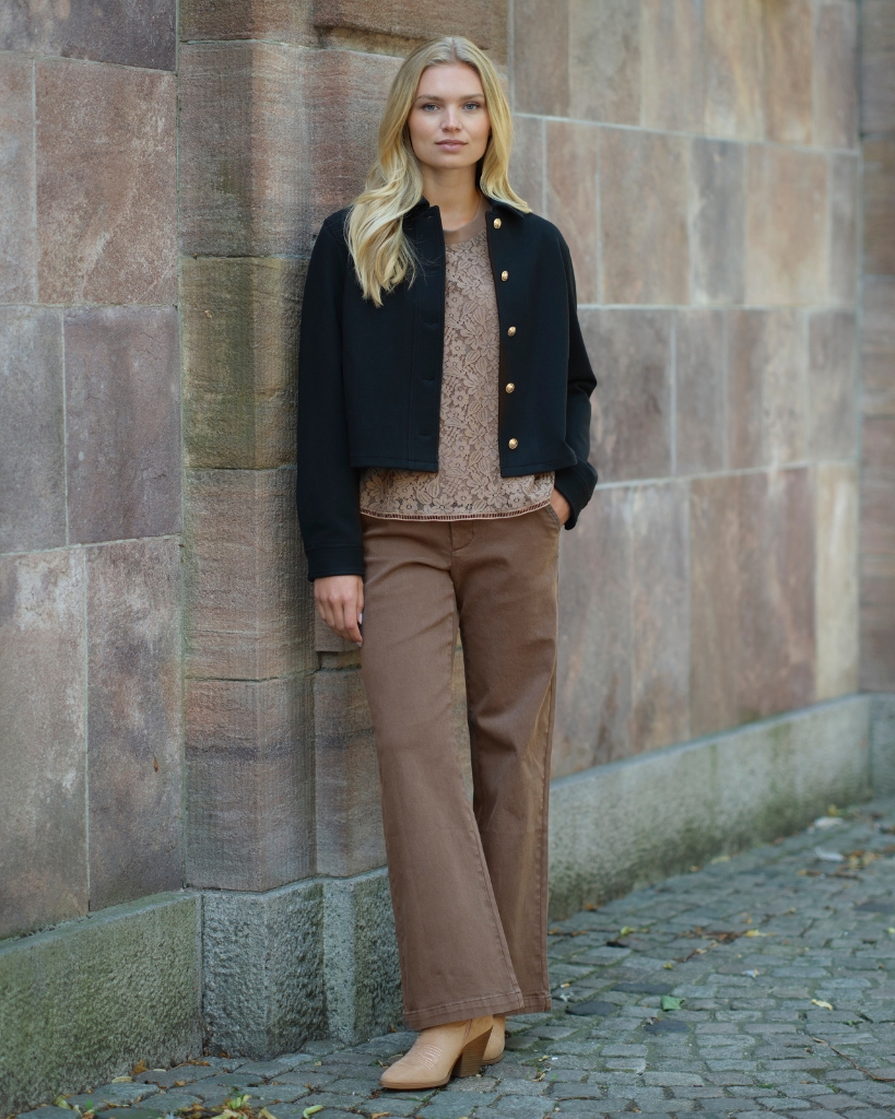 Malia Jeans er en blød og komfortabel jeans i en skøn cappuccinofarve. Den har en flatterende vid pasform, to sidelommer og pyntebaglommer. Lukkes med lynlås og en enkelt knap for et klassisk look.