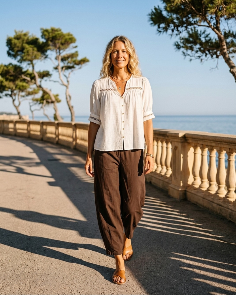 Let og feminin bluse fra Prepair i en blød kvalitet med fine detaljer. Den har V-hals og gennemknappet front, som giver et klassisk og let udtryk. De korte ærmer og dekorative hulmønstre tilfører et elegant og luftigt look.
