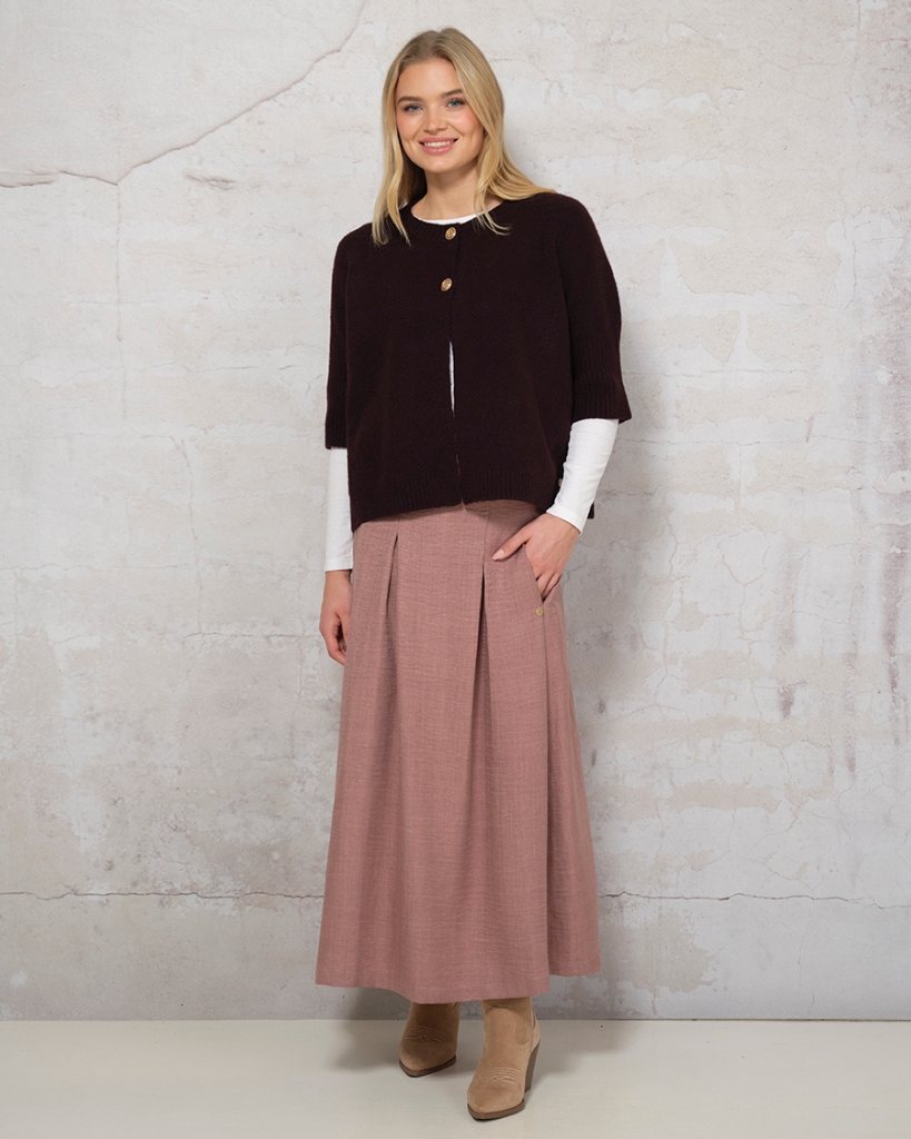 Naomi Knit Cardigan fra Prepair er en blød og let strikket cardigan med rund hals og korte ærmer. Den har ribkant ved ærmer og nederkant samt fine guldknapper foran, der giver et elegant udtryk. Pasformen er afslappet med god vidde. Modellen er stor i størrelsen – vi anbefaler at gå en størrelse ned.