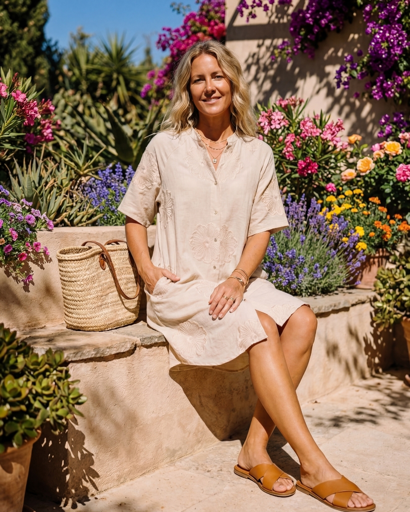 Elegant og feminin kjole med smuk tone-i-tone brodering, der giver et eksklusivt udtryk. Den har rund hals med lille V-åbning og gennemgående knaplukning samt praktiske lommer i siderne. Den let A-formede pasform sikrer et flot fald og god komfort.