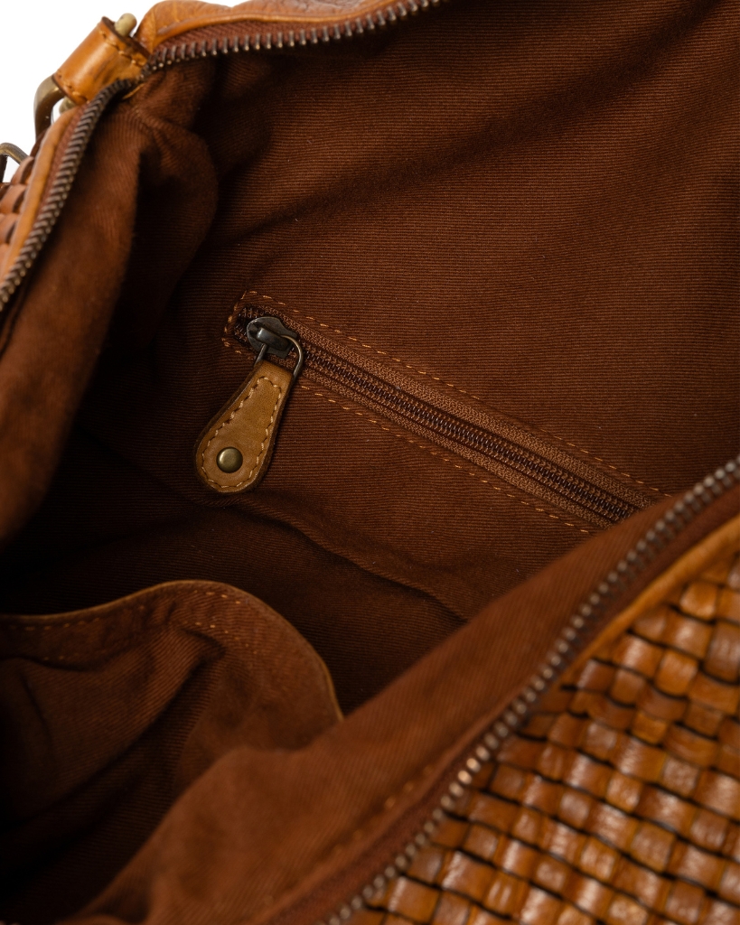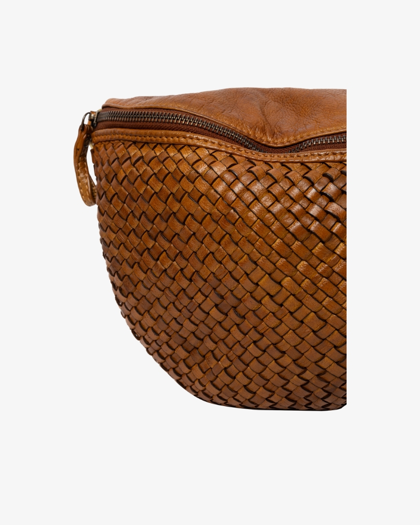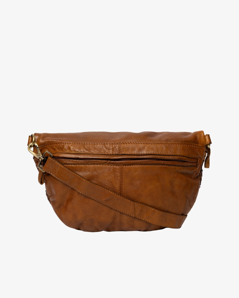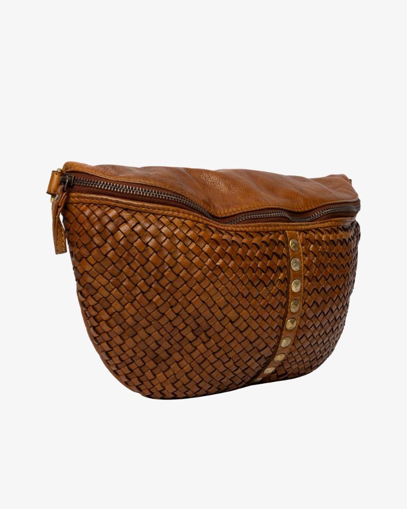 En rummelig og eksklusiv bumbag i flettet skind fra Re:Designed. Den varme cognacfarve og de gyldne nitter giver tasken et håndlavet og råt udtryk. Perfekt til dig, der ønsker både stil og funktionalitet i hverdagen. Den brede skulderrem sikrer høj komfort, og indvendigt finder du både lynlåslomme og åbent rum til småting.