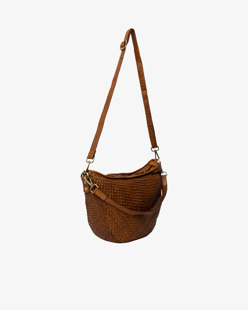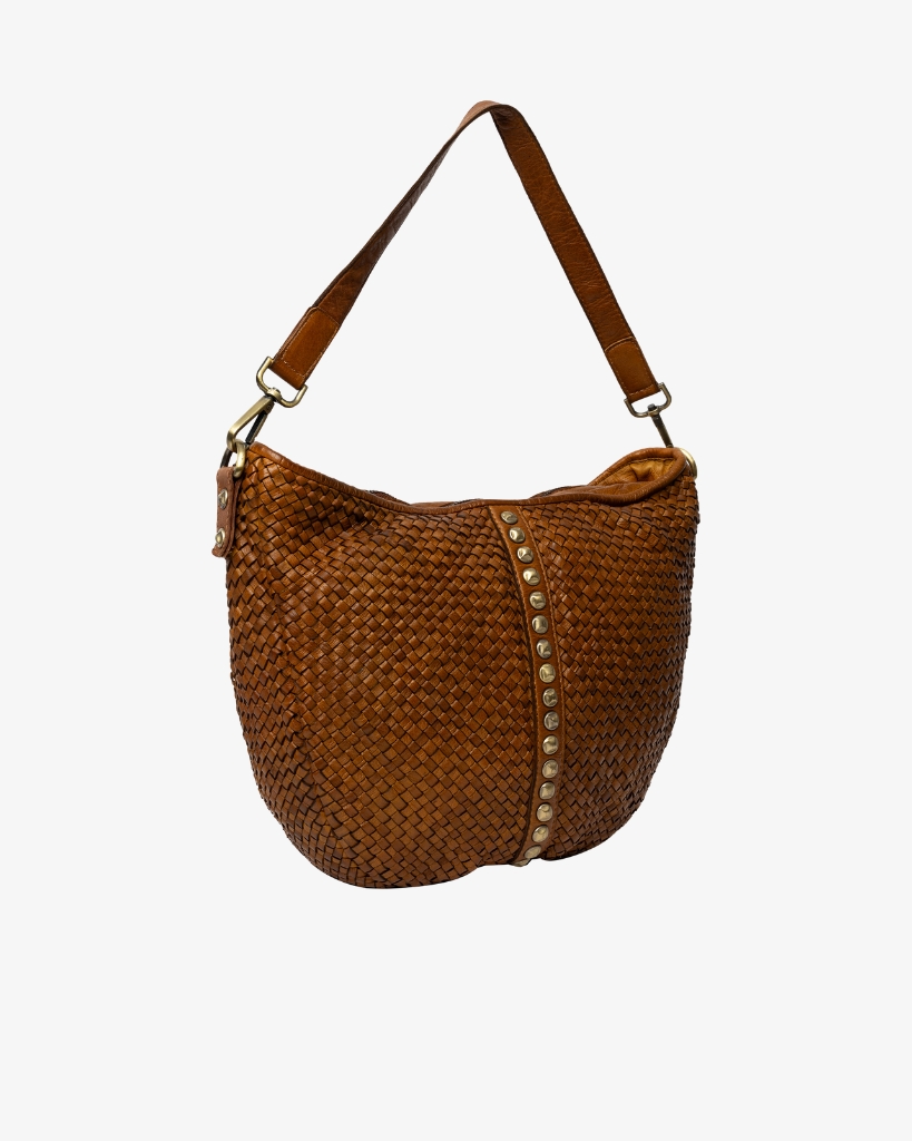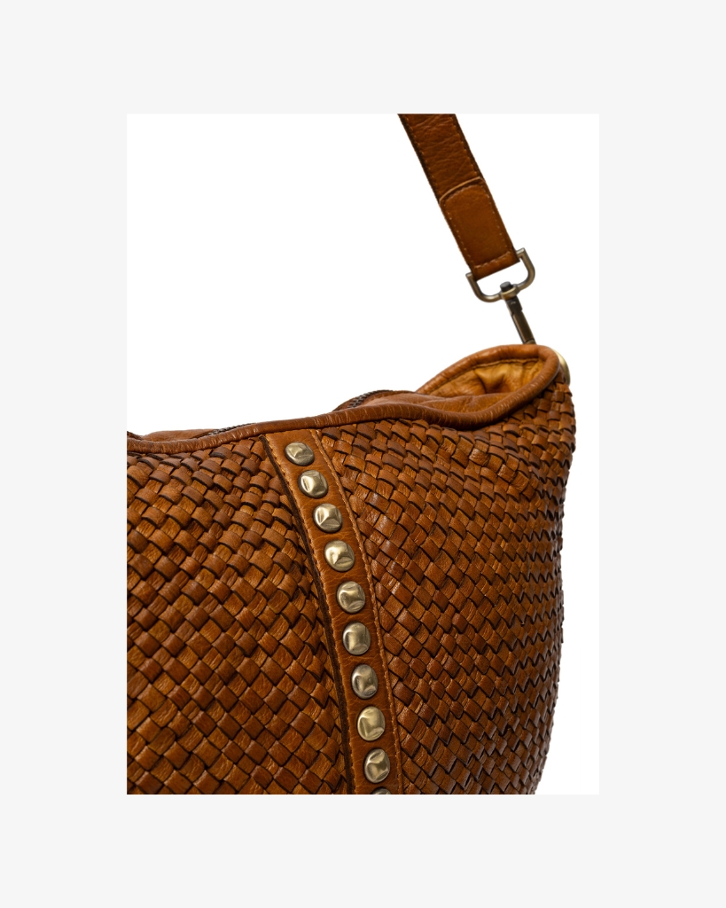 En rummelig og lækker taske i blødt skind fra Re:Designed. Tasken har et flot flettet mønster på fronten og en markant række af rå nitter, som giver karakter. Den kommer med både en kort og en lang rem, så du kan bære den over skulderen eller som crossbody.