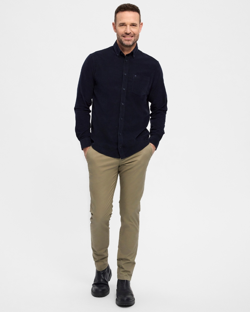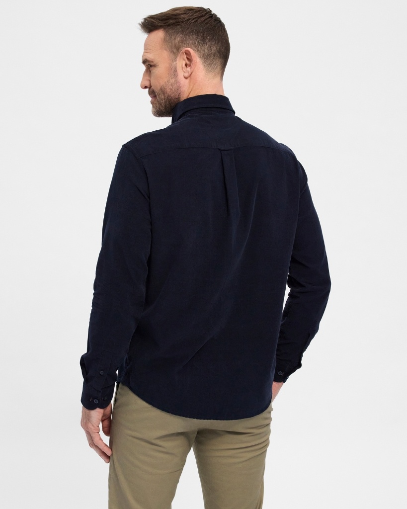 En klassisk fløjls-skjorte med nordisk inspiration og en dyb navy farve. Lavet i 100% bomuld med button-down krave, brystlomme og et tidløst udtryk, der holder sæson efter sæson.