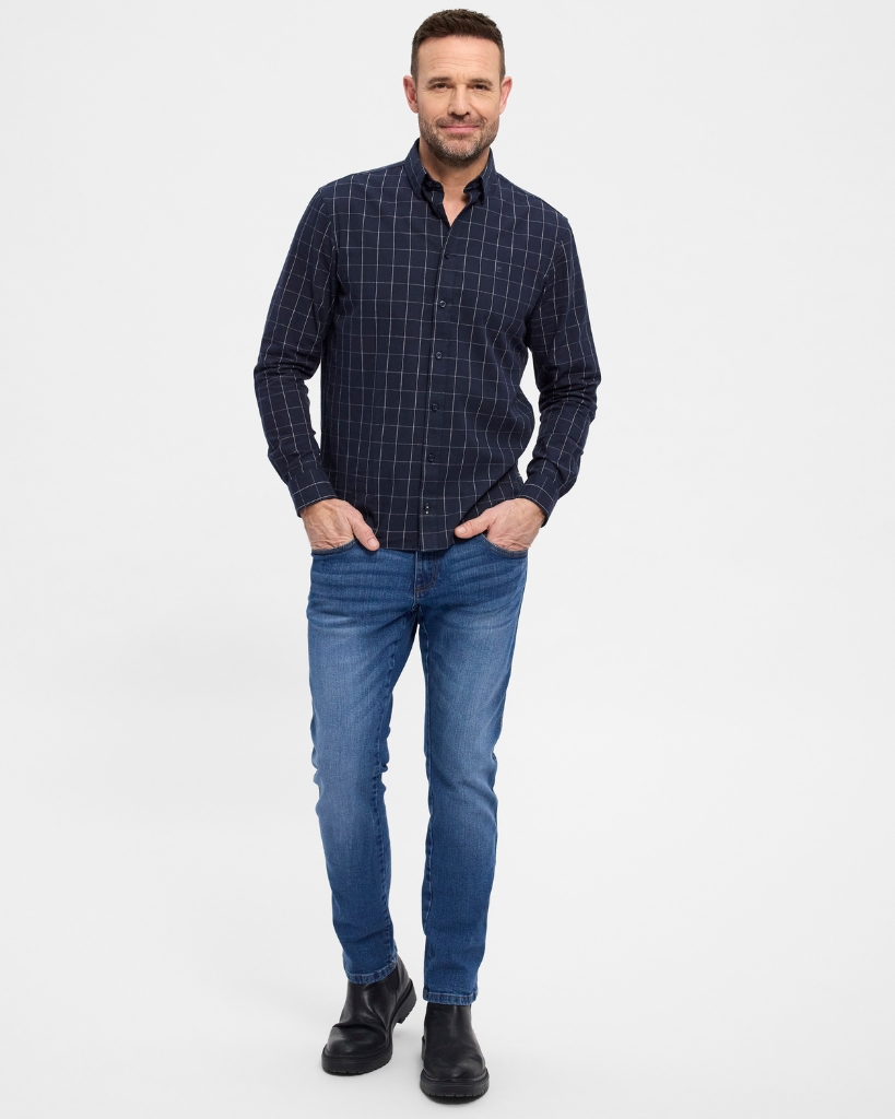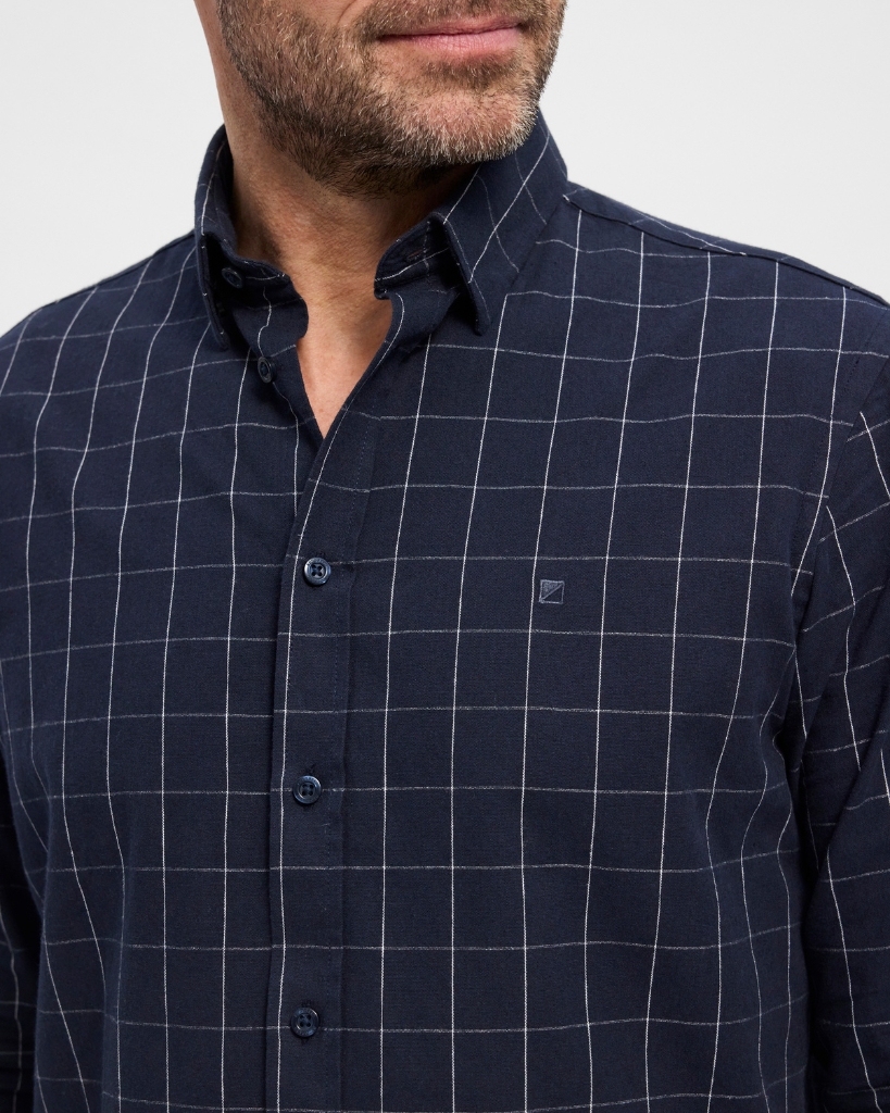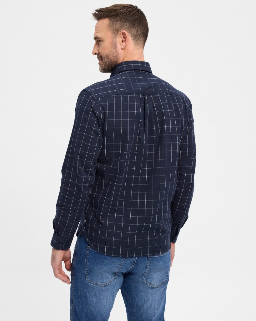 Giv garderoben et løft med denne klassiske langærmede skjorte i navy tern. Den er lavet i blød bomuld med et enkelt, tidløst udtryk og en regular pasform, der giver god bevægelighed. Perfekt til en afslappet, men velklædt stil.