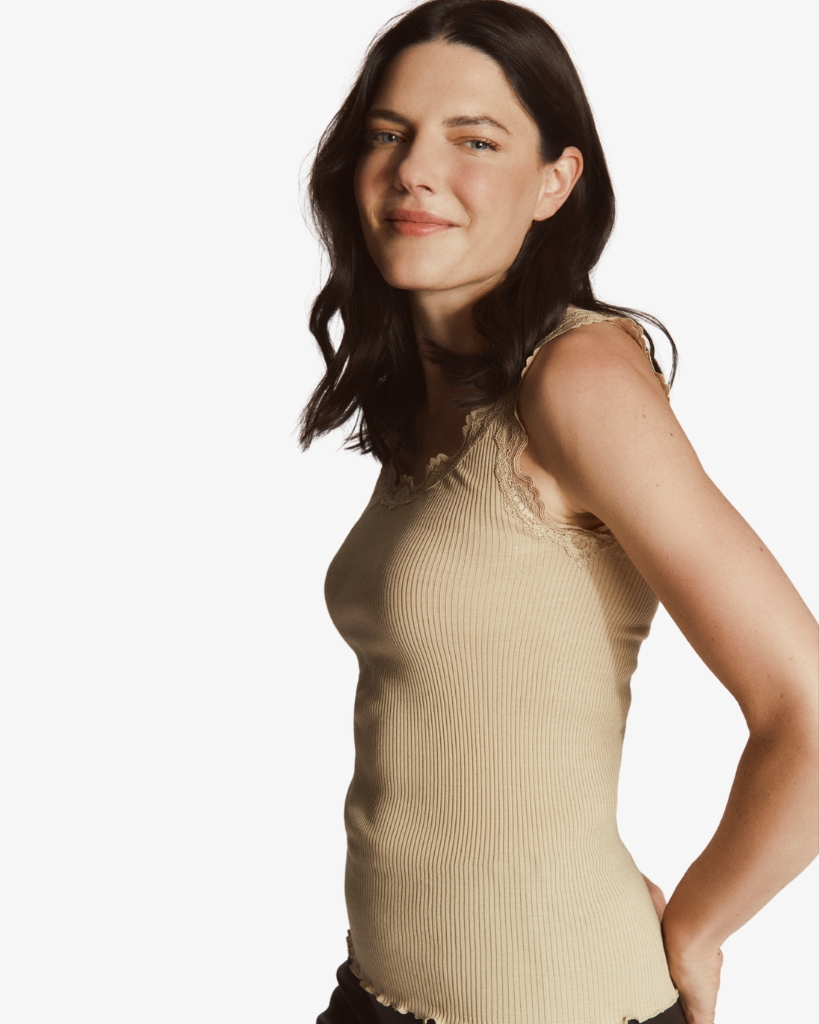 Rosemundes ikoniske silketop er designet i en blød ribstrikket silkekvalitet med en elegant blondekant omkring den runde halsudskæring. Toppen er rundstrikket uden sidesømme, hvilket giver en ekstra behagelig pasform. Den fine krølkant forneden fuldender det feminine og klassiske udtryk.