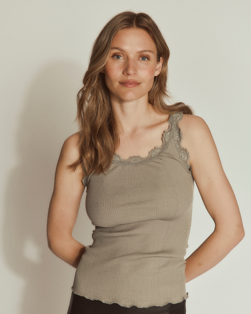 Rosemundes ikoniske silketop er designet i en blød ribstrikket silkekvalitet med en elegant blondekant omkring den runde halsudskæring. Toppen er rundstrikket uden sidesømme, hvilket giver en ekstra behagelig pasform. Den fine krølkant forneden fuldender det feminine og klassiske udtryk.