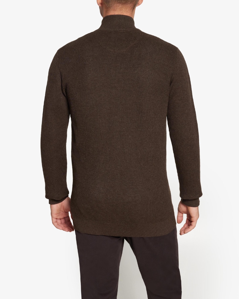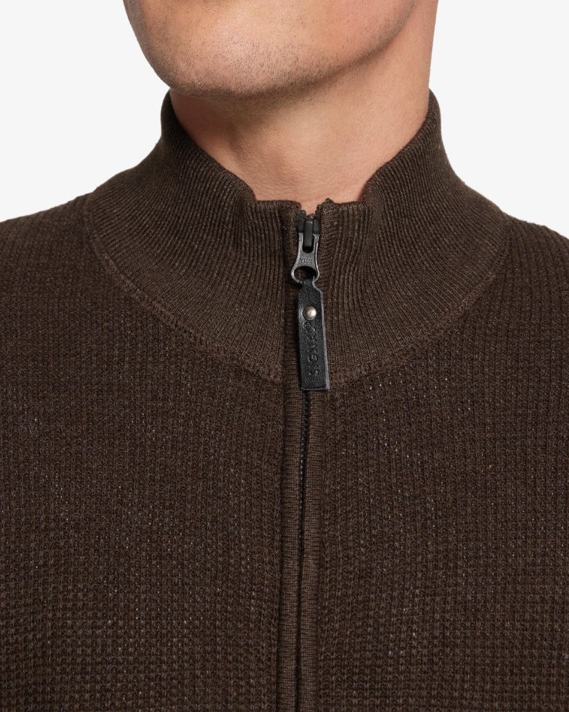 En stilren cardigan i struktureret bomuldsstrik med gennemgående lynlås. Den brune melerede farve og høje krave giver et afslappet og tidløst udtryk – perfekt til lag-på-lag.