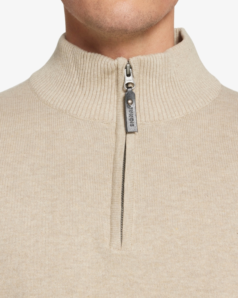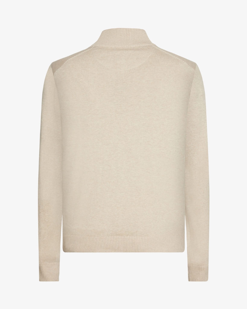 KlausSI Halfzip + er en blød og let striktrøje med lynlås i halsen, lavet af 100% økologisk bomuld. Den melerede beige farve giver et moderne og afslappet look, mens ribkanter sikrer en flot pasform.
