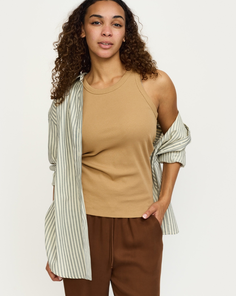 Blød og lækker top i brunlig nuance i en behagelig ribkvalitet med stræk. Den tætsiddende model har rund hals og brede stropper, som giver et rent og feminint udtryk. Længden er 63 cm i str. S.