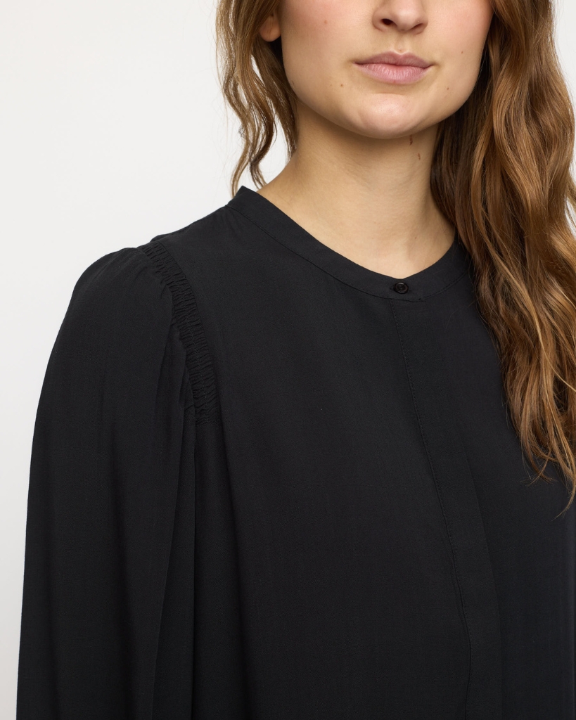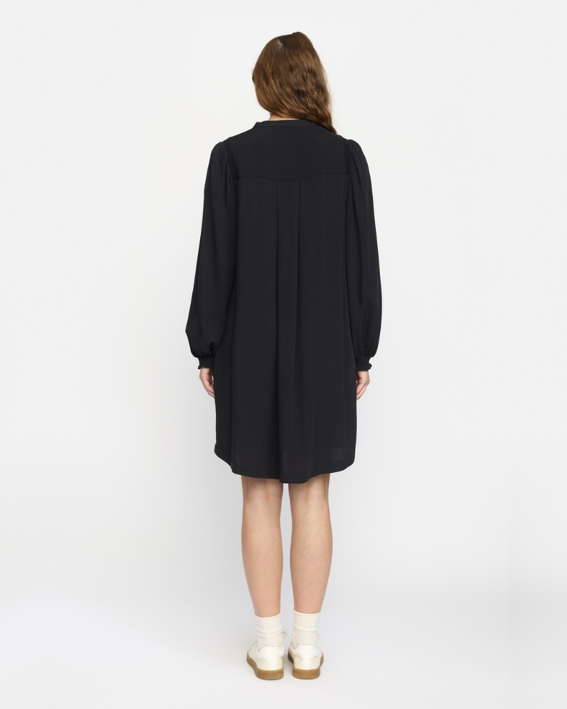 Enkel og feminin kjole med løs pasform og fine detaljer. Den har kinakrave, skjult knappelukning og lange ærmer med rynket afslutning. Perfekt til dig, der ønsker komfort uden at gå på kompromis med stilen.