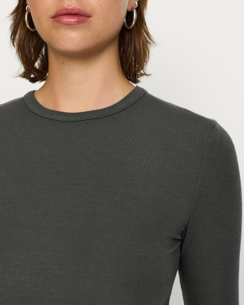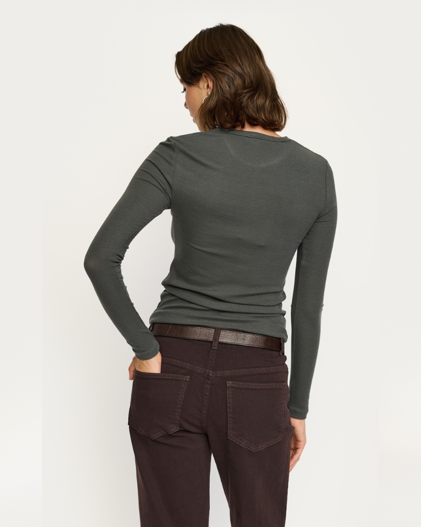 En basic slim-fit top i rib materiale. Produceret med rund hals og lange ærmer. Perfekt langærmet hverdagstop, kan sættes sammen med jeans eller en nederdel.