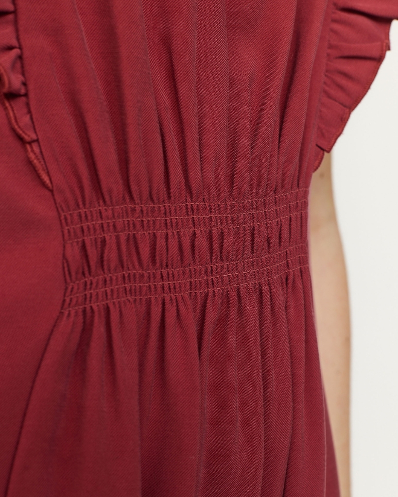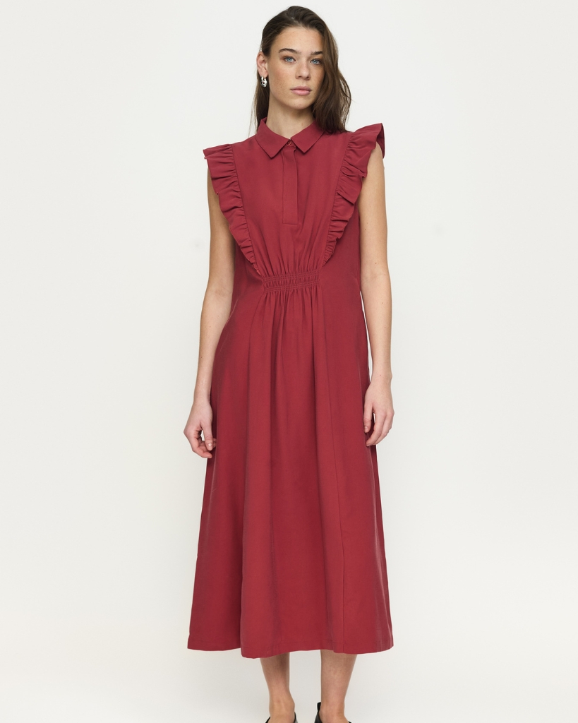 En feminin kjole fra Soft Rebels i en blød og let kvalitet, der falder flot på kroppen. Designet med fine flæsedetaljer ved skuldrene og en markeret talje, som giver en smuk silhuet. Den lukkes diskret ved brystet og har en elegant længde. En kjole med både komfort og karakter.