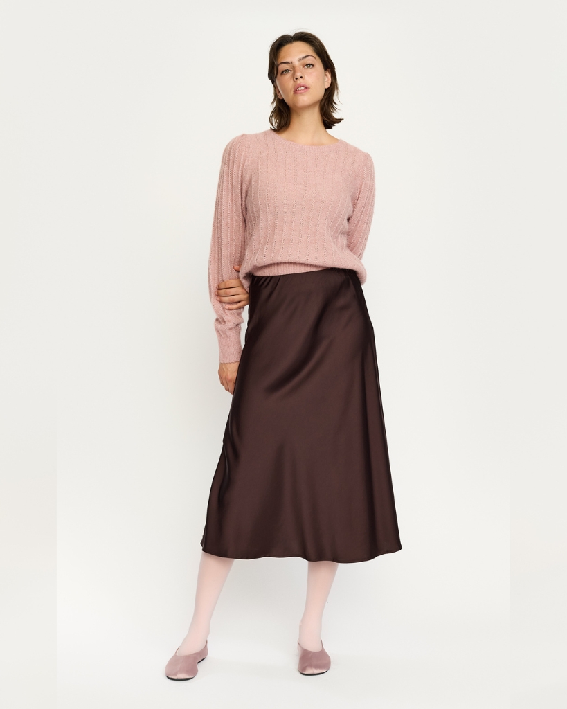 Blød og feminin strik med fine lodrette strikkede detaljer og diskret pufærme. Ribkanter og rund hals gør den perfekt til både pænt og afslappet brug.