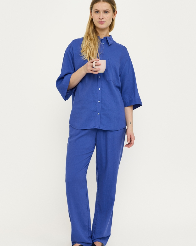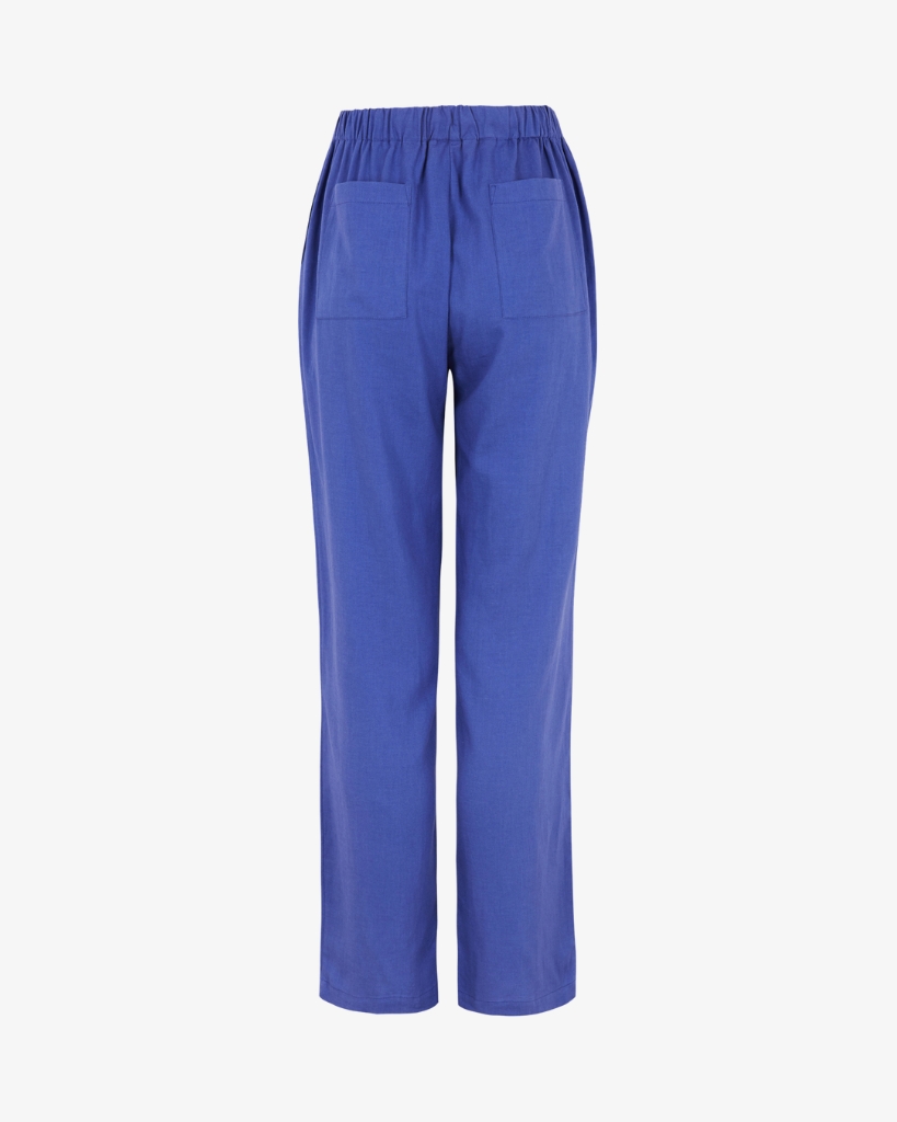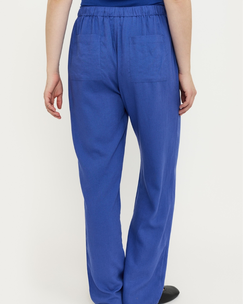 Smukke bukser i en klar blå nuance med et let og naturligt fald. Modellen har elastisk talje med bindebånd, som giver en fleksibel og behagelig pasform. De lige ben og den enkle silhuet skaber et roligt og stilrent udtryk. En let kvalitet med blød struktur.
