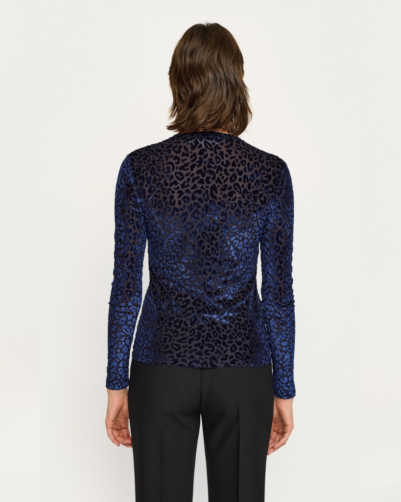 Denne figursyede mesh-bluse har et glansfuldt leopardmønster i dyb blå fløjl. Den lette kvalitet og tætte pasform giver en flatterende silhuet med et spændende teksturspil.
