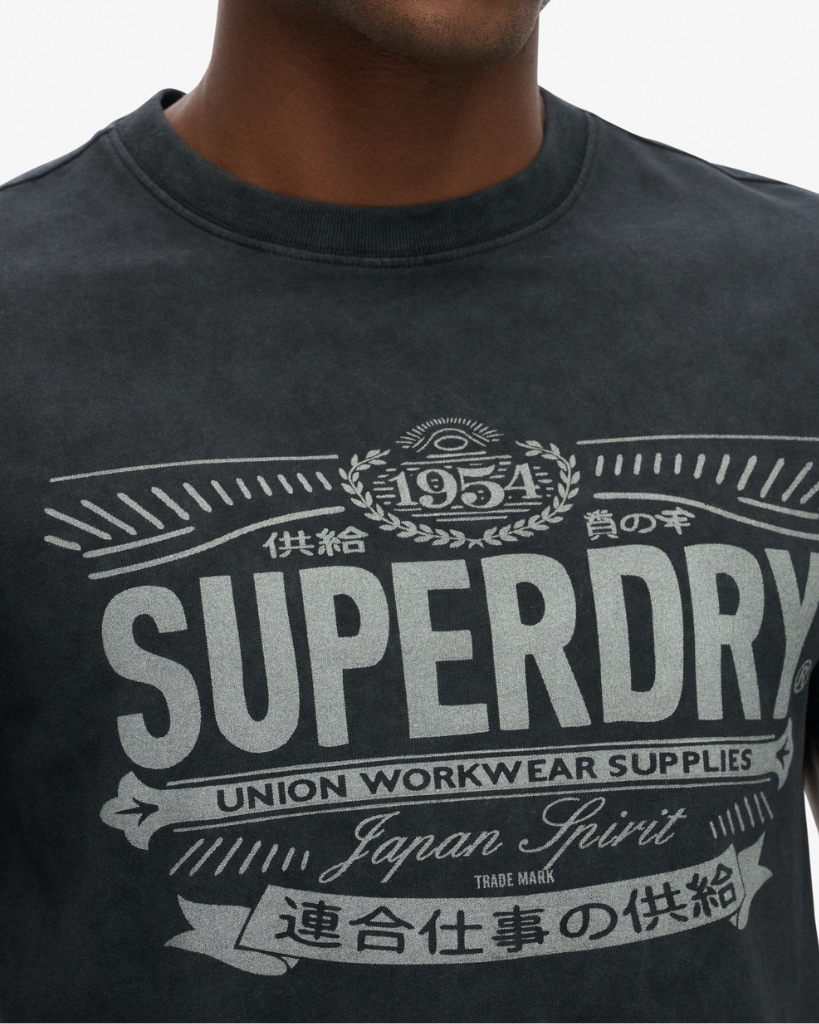 Gå efter et afslappet og gennemført look med denne Superdry T-shirt i vasket sort. Den har et markant vintageinspireret print på brystet og en løsere pasform, der giver ekstra komfort.