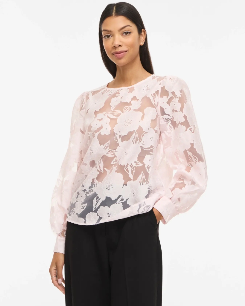 Let og feminin bluse i transparent jacquard med vævet blomsterstruktur. De let puffede ærmer og knaplukning i nakken fuldender det elegante udtryk.