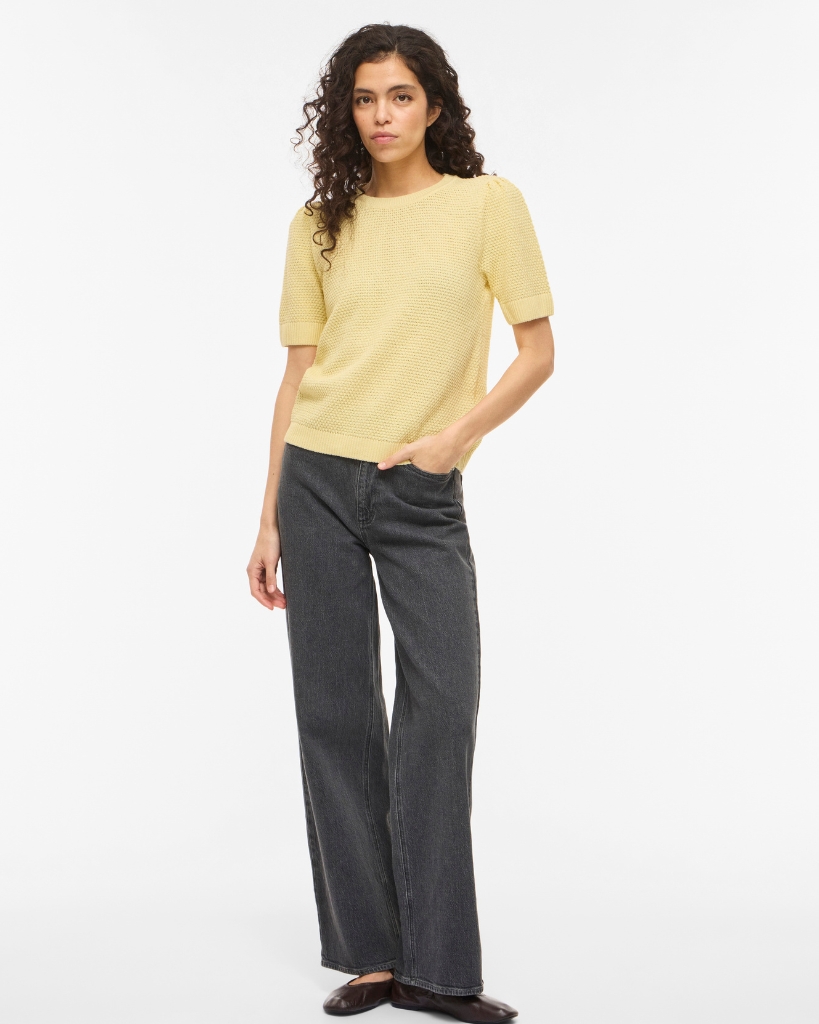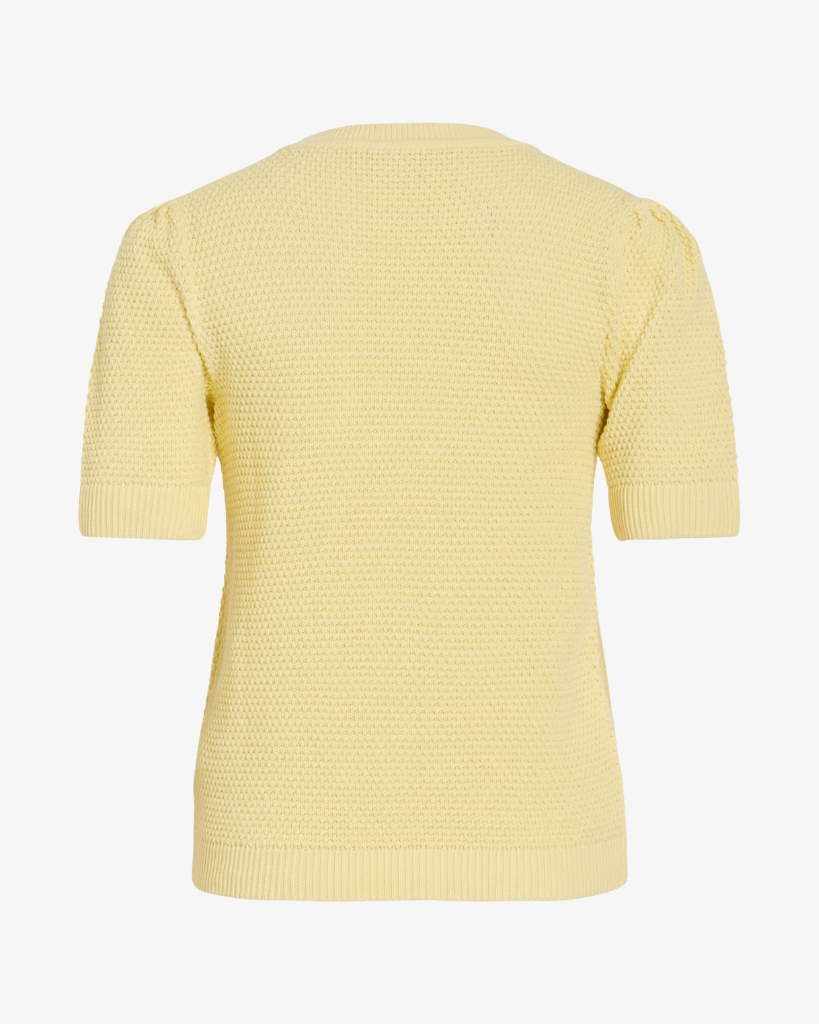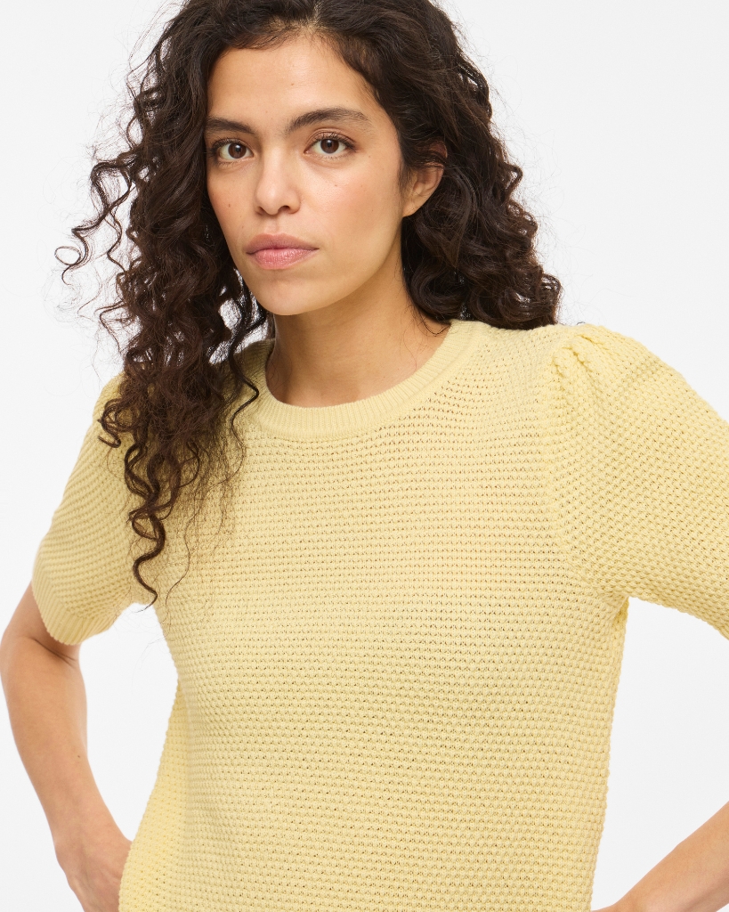 Finstrikket top i en lys pastelgul nuance med flot, struktureret strik. Den har rund hals og korte ærmer med ribkant, som giver et pænt og velafsluttet udtryk. Den elastiske kvalitet sikrer god bevægelighed og en behagelig pasform. Almindelig i størrelsen.