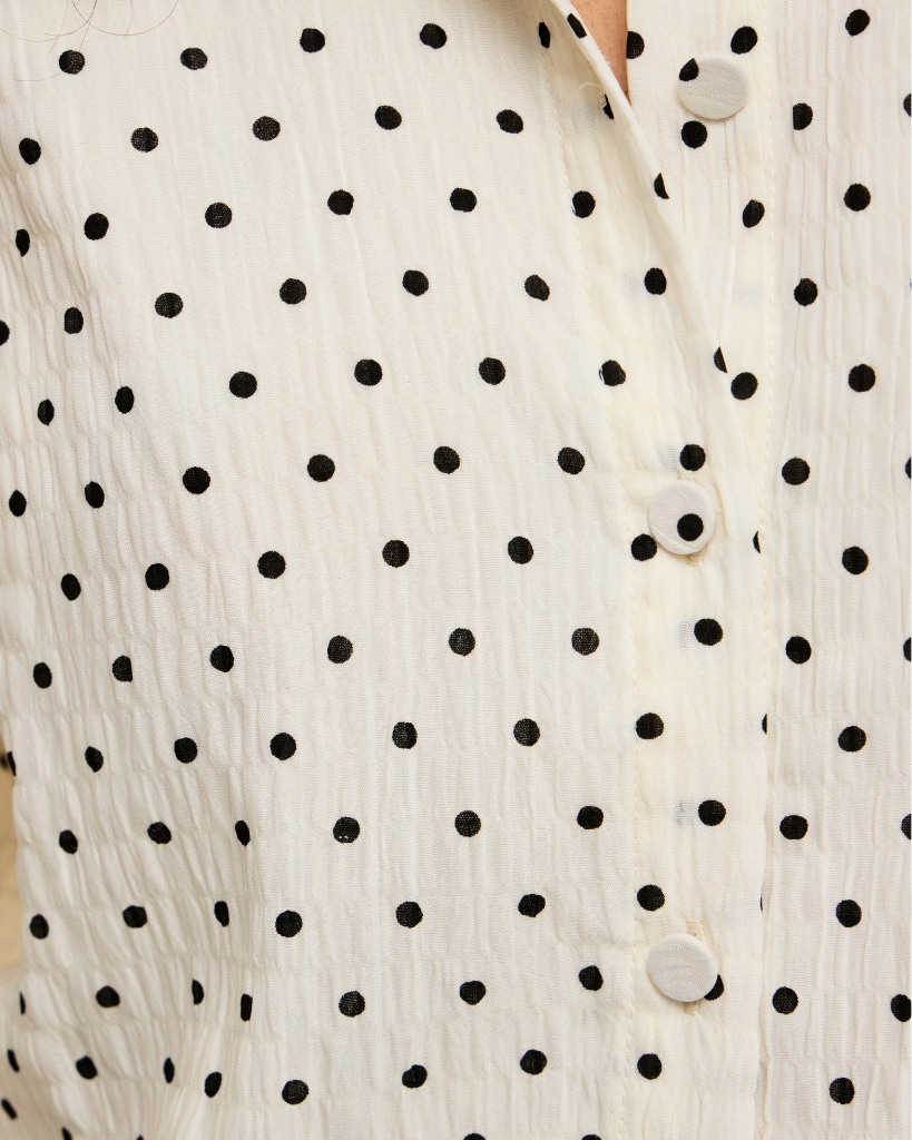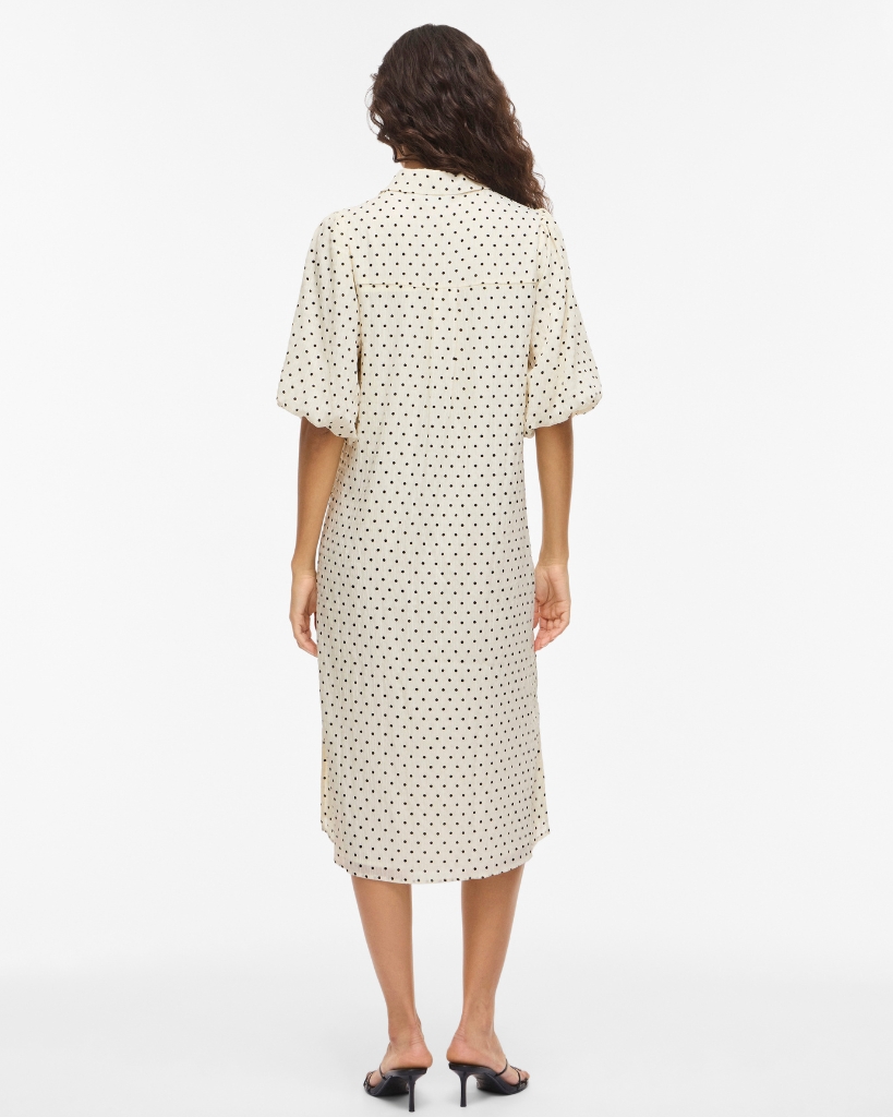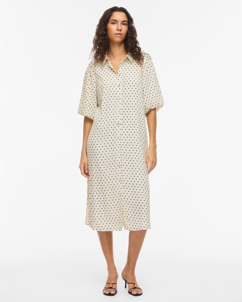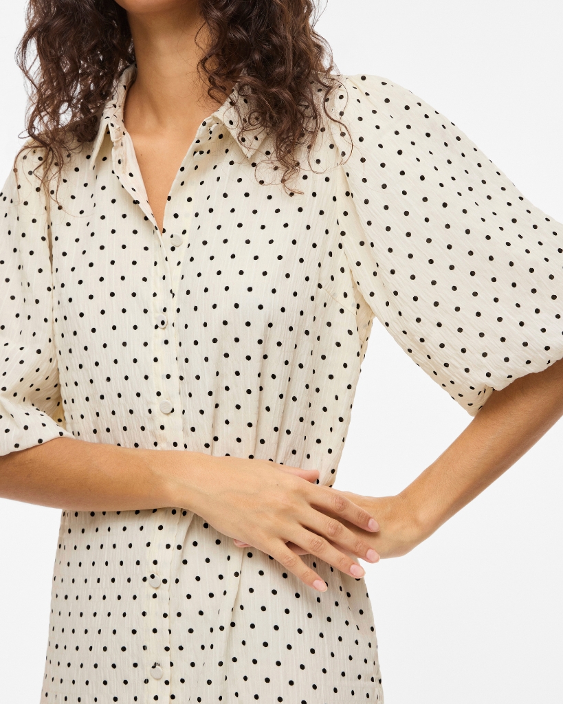 Elegant, polkaprikket midikjole i en let kvalitet med flot struktur i stoffet. Kjolen har klassisk skjortekrave, korte ærmer med god vidde og gennemgående knaplukning foran. Den er med foer og ikke gennemsigtig, og er almindelig i størrelsen.