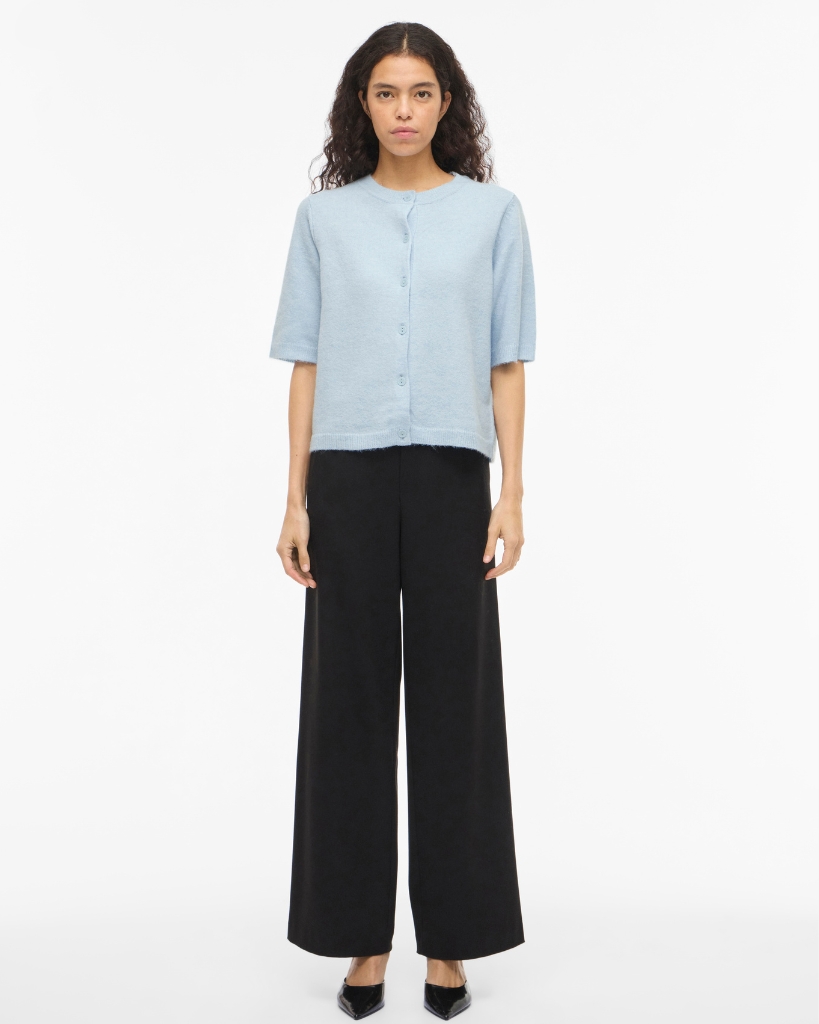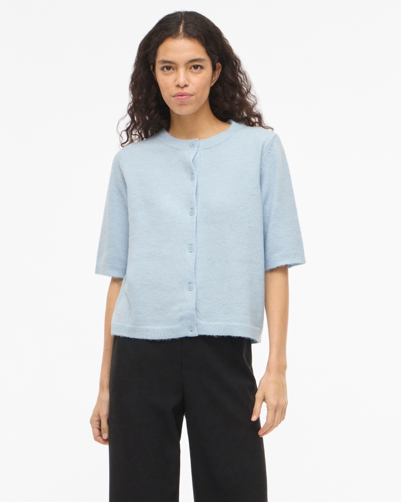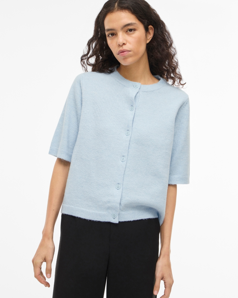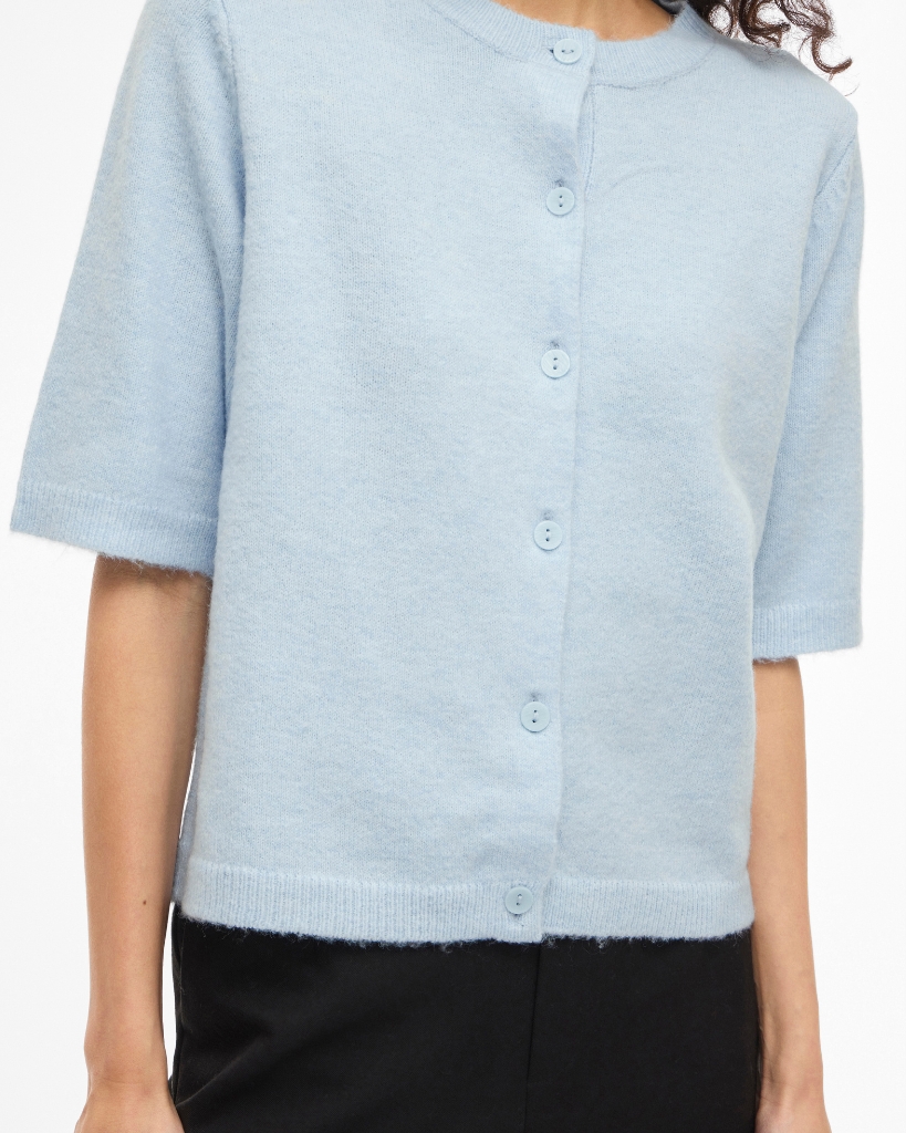 Kortærmet strikket cardigan i en smuk lyseblå nuance. Den har rund hals og gennemgående knaplukning, som giver et klassisk og enkelt udtryk. Den bløde og strækbare kvalitet samt ribkanter ved ærmer og bund sikrer en flot pasform. Almindelig i størrelsen.