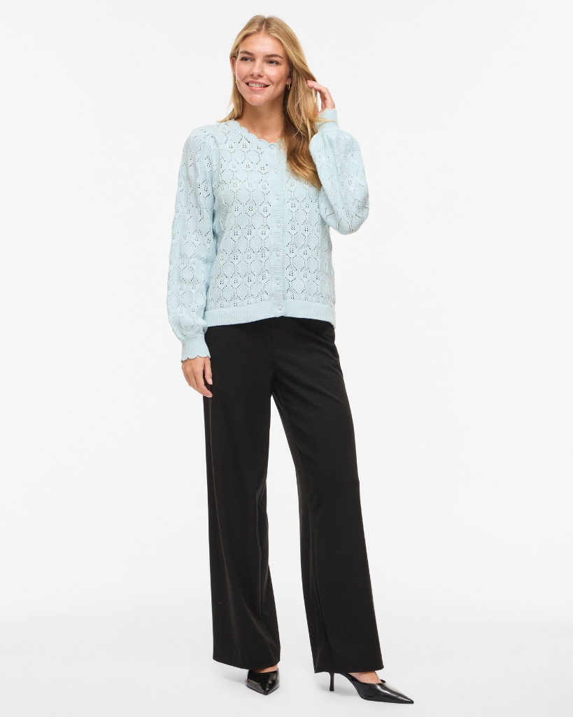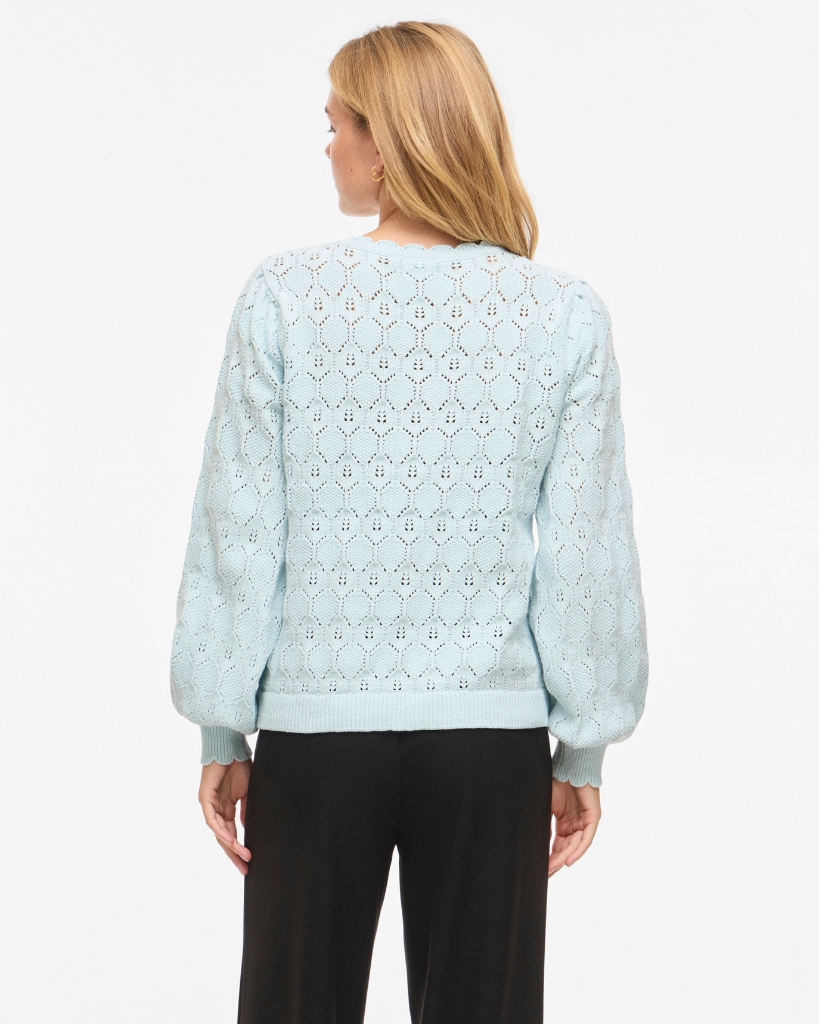 Smuk, pointelle-strikket cardigan i en frisk lyseblå nuance. Den fine hulstrik og den dekorative bølgekant ved hals og manchetter giver et feminint og let udtryk. Cardiganen lukkes med små knapper foran og har rib ved bund og ærmer for en flot afslutning. Normal i størrelsen.