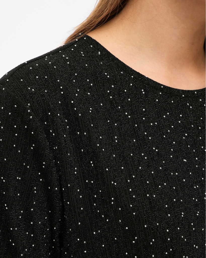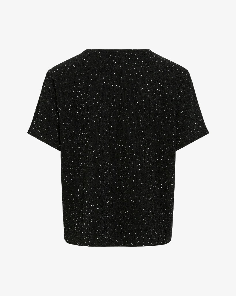 En funklende t-shirt i sølvlook, der kombinerer komfort og glans. Den elastiske glitterkvalitet giver et flatterende fald og gør den perfekt til særlige anledninger med lidt ekstra blikfang.