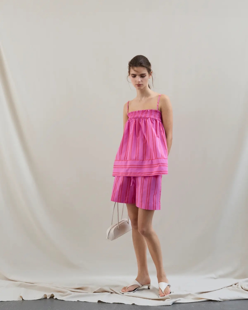 Et par lette og sommerlige shorts i en blød bomuldskvalitet med fine striber. De har elastisk talje med bindebånd, som giver en fleksibel og behagelig pasform. Den løse pasform sikrer et afslappet fald og god komfort.